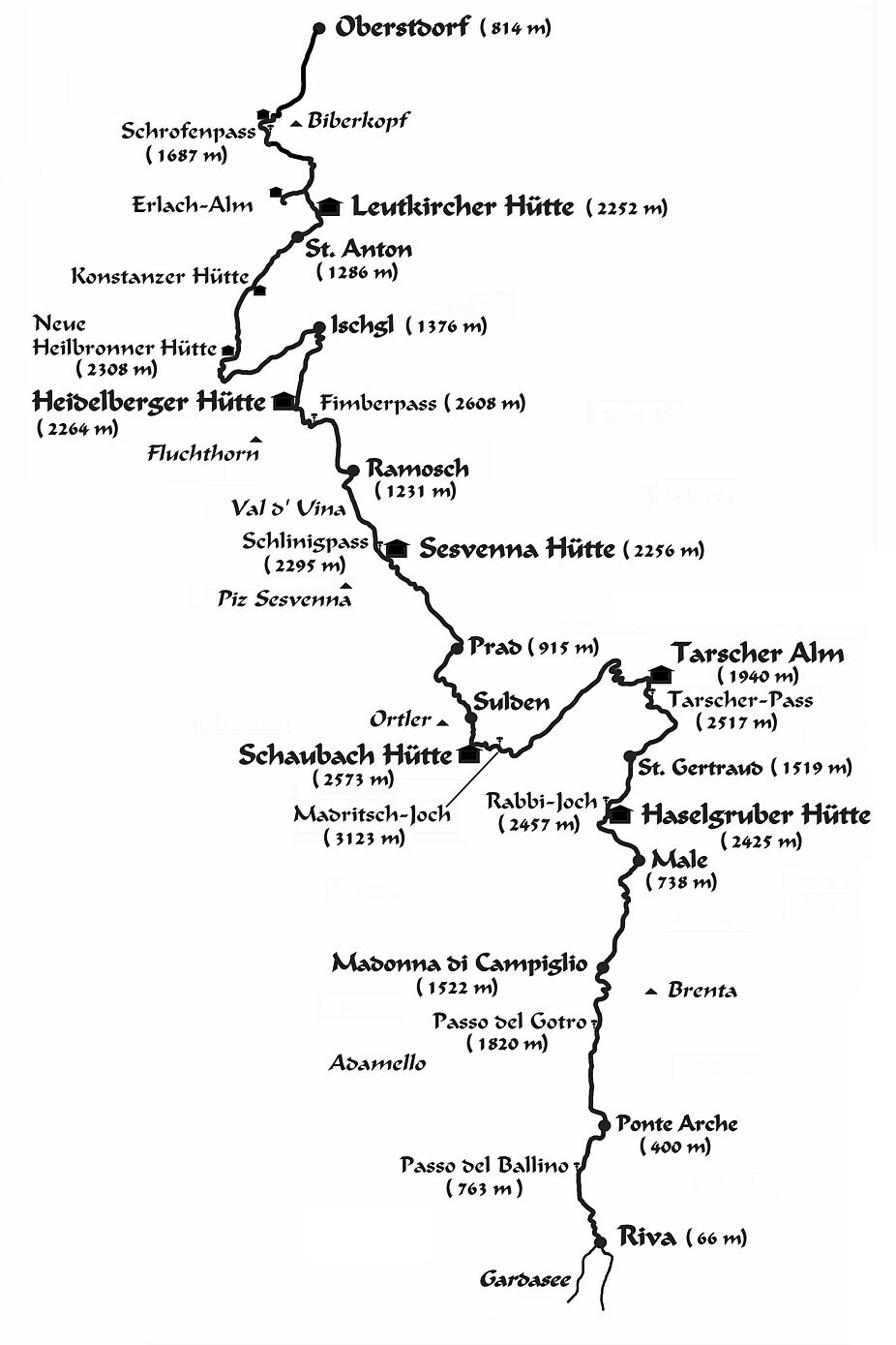 Nach Tagen der Aufregung, des Hin- und Hergerennes wegen Bremsbacken, Müsli-Riegel und Leicht-Zahnpasta wurde die nervliche Anspannung endlich abgelöst durch die muskuläre. Spektakulär der Schrofenpass mit seiner Felsgalerie, in den Lechtaler Alpen noch Schlimmeres: Eine Passage an der Nordflanke des Valuga-Massivs war unpassierbar, mindestens mit unseren Rädern, also 400 Höhenmeter hinunter und auf einem anderen passierbaren Weg 700 Höhenmeter hinauftragen zur Leutkircher Hütte, dort Ankunft 20.30 Uhr. Der erste Tag - die Bewährungsprobe - war geschafft.