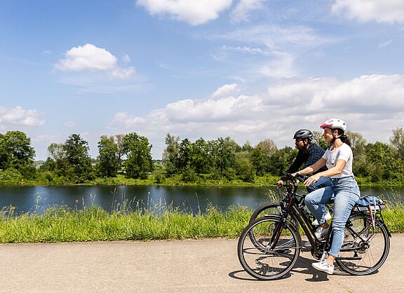Zwei Radfahrerinnen auf einem asphaltierten Radweg durch eine naturbelassene Flusslandschaft